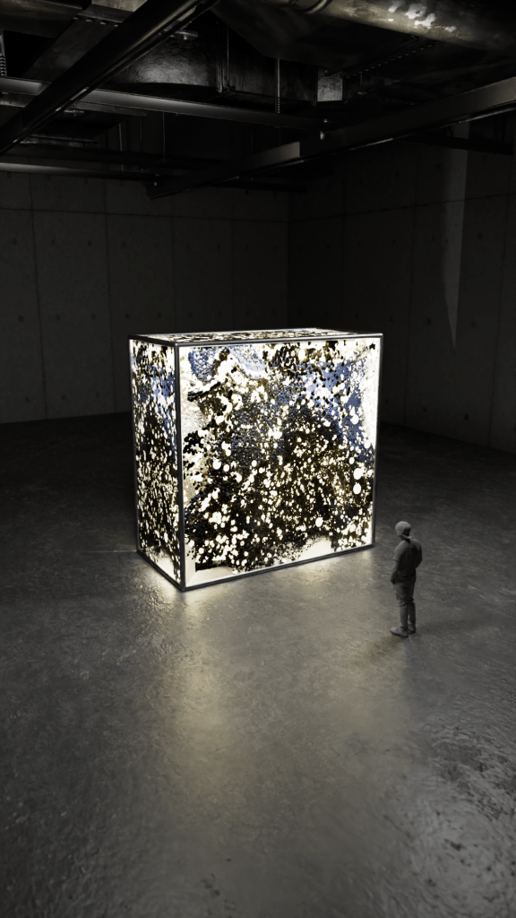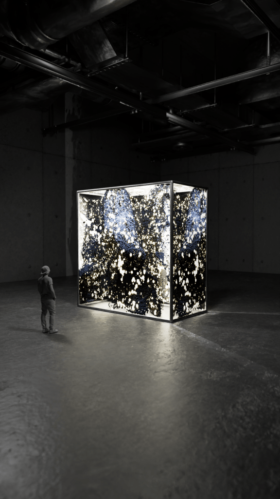 The artwork is based on a tracking system that follows the viewers’ physical presence and movements. By moving around the piece or making different gestures, viewers create their own reflections in real time within the hologram sculpture. This sculpture emerges as a structure reflecting the physical features and movements of the viewer. Additionally, artificial intelligence algorithms that analyze the viewer’s movements determine the sculpture’s behavior and responses, offering a unique experience for each viewer.